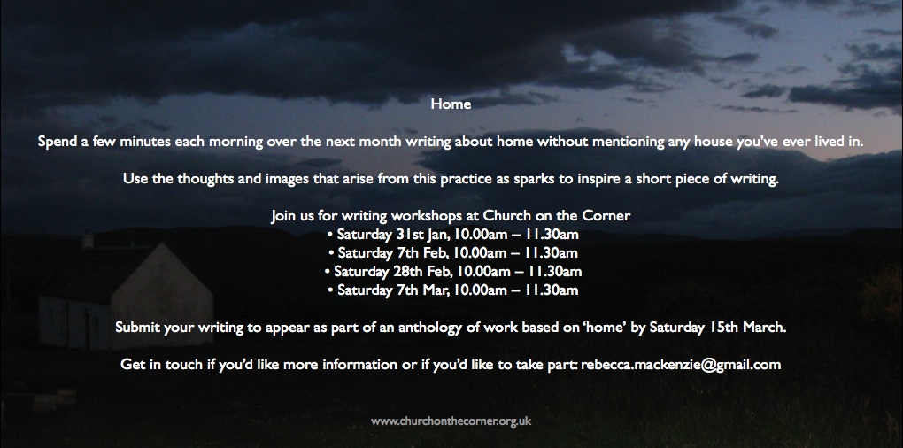 If you’re interested in taking part in this process (whether that be just writing at home or coming along to the workshops too), do let me know by emailing rebecca.mackenzie@gmail.com