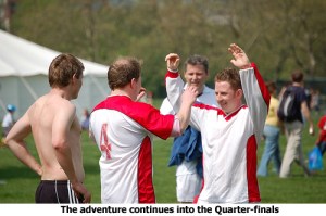 A split second later he was besieged by his grateful teammates, led by his captain Mawhinney. One of the giants of the tournament had been conquered and now anything seemed possible. But while the crowd could celebrate and start to party the team still had a job to do. They were facing a team from the co-organisers, Hackney Ambassadors, and Ambassadors weren’t there to just play a walk on-walk off part.